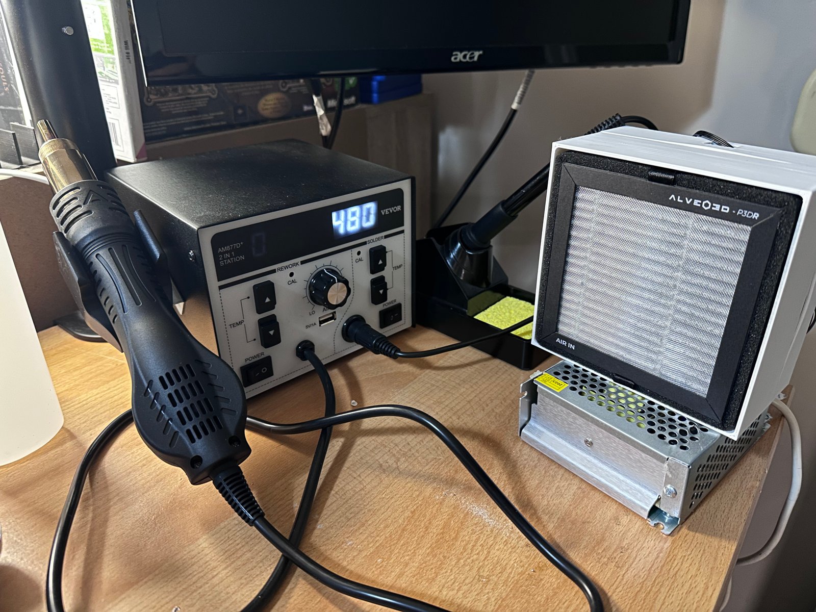 Commentaire : Pour ce projet, j'ai utilisé la station de soudage de la marque Vevor. Elle comprend le fer à souder et un pistolet à air chaud. J'ai aussi utilisé un filtre anti-fumée (type HEPA) pour capter les émanations toxiques liées à la soudure.